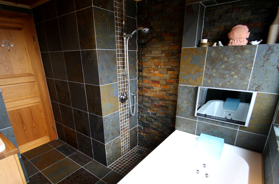 This multi coloured slate bathroom was completed to a very high specification, with a large Jacuzzi Bath and matching suite.  Mitred edges were used to create seamless tiled corners.  The TV you can watch while sitting back and relaxing in the large Spa Bath just tops it all off.